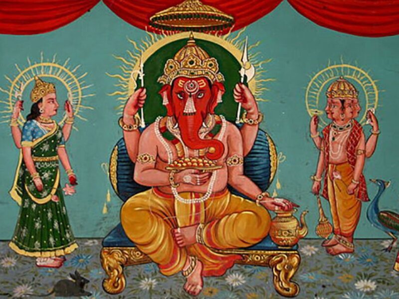Ganesh est connu pour sa tête d’éléphant et chacun de ses nombreux noms correspond à ses différentes caractéristiques. Alors que le nom “Ganesha” est utilisé dans le nord de l’Inde, dans le sud de l’Inde, on préfère l’appeler “Ganapati”, ce qui signifie “Seigneur des armées”, car il est le chef des Ganas, le régiment de Shiva. Ses autres noms tels que “Ekadanta” ou “Pillaiyar” sont dérivés de son apparence avec une seule défense, car il aurait enlevé l’une d’entre elles pour écrire l’épopée du Mahabharata (400 avant J.-C. – 400 après J.-C.).